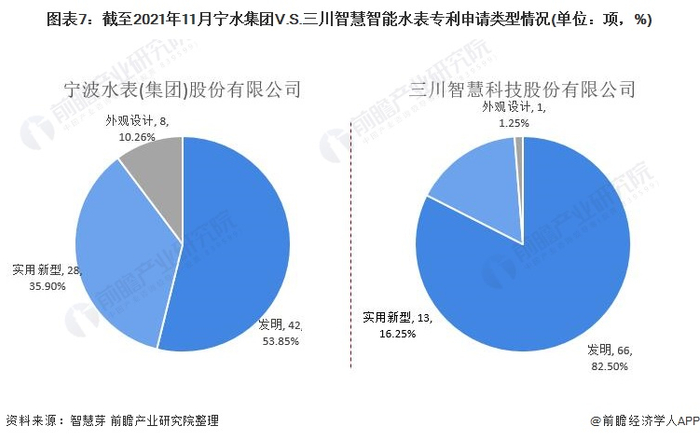 宁水集团和三川智慧智能水表专利申请类型以发明专利为主,发明专利数量分别为42项和66项。另外,宁水集团在外观设计类的专利布局亦较多,占比为10.26%。