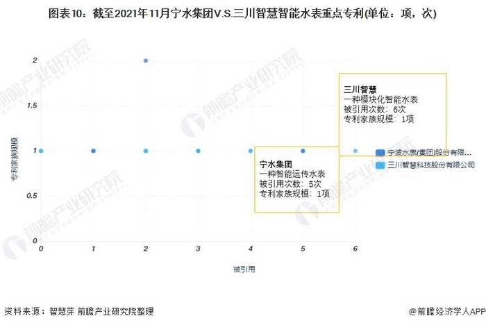 在重点专利布局上,宁水集团重点布局的专利为“一种智能远传水表”,该项专利被引用次数5次,专利家族规模为1项。三川智慧重点布局的专利为“一种模块化智能水表”,该项专利被引用次数6次,专利家族规模为1项。整体来看,三川智慧重点布局的专利在专利被引用次数较多。