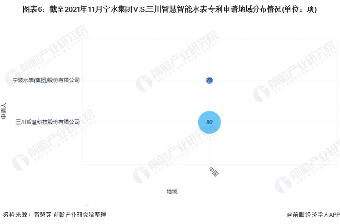 目前,宁水集团和三川智慧的智能水表专利申请区域主要集中在中国。截至2021年11月15日,宁水集团和三川智慧在中国的专利申请数量分别为78项和80项。