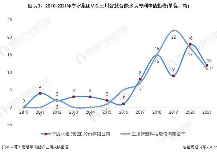 从趋势上看,2010-2020年,宁水集团和三川智慧在智能水表专利申请数量上呈现“你追我赶”的趋势。2020年,宁水集团和三川智慧公司的智能水表专利申请数量分别为18项和17项。
