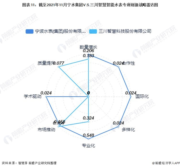 整体来看,宁水集团智能水表技术在数量增长、合作性、国际化、多样化、专业化和学术驱动方面具有相对竞争优势。三川智慧在质量提升方面有相对竞争优势。两者智能水表技术在市场推动方面相当。