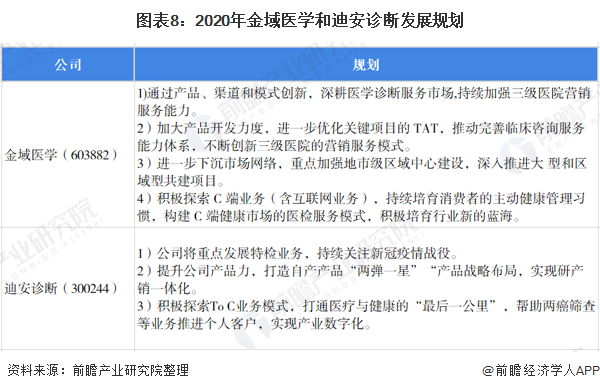 2020年,金域医学和迪安诊断都在增强产品创新能力和加速销售渠道布局有所规划,同样,为了进一步拓宽市场,两公司均对TO C的业务模式进行布局,以获取更多的个人客户。