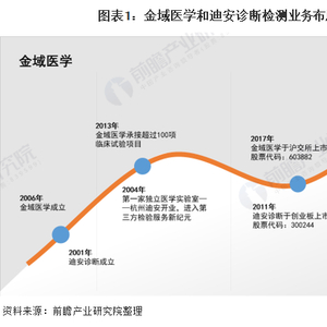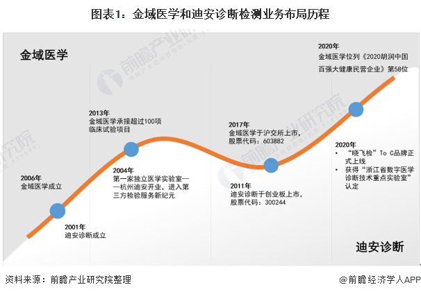 金域医学成立于2006年,于2017年沪交所上市,股票代码603882,2020年位列《2020胡润中国百强大健康民营企业》第58位;迪安诊断成立较早,2004年成立其第一家独立医学实验室——杭州迪安,2011年迪安诊断于创业板上市,股票代码:300244,2020年,获得“浙江省数字医学诊断技术重点实验室”认定。