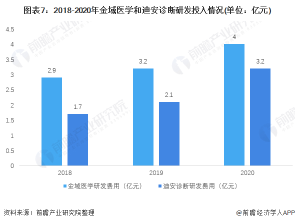 2018-2020年,金域医学和迪安诊断的研发投入呈不断上升趋势,2020年,金域医学研发投入较多,达到4亿元。