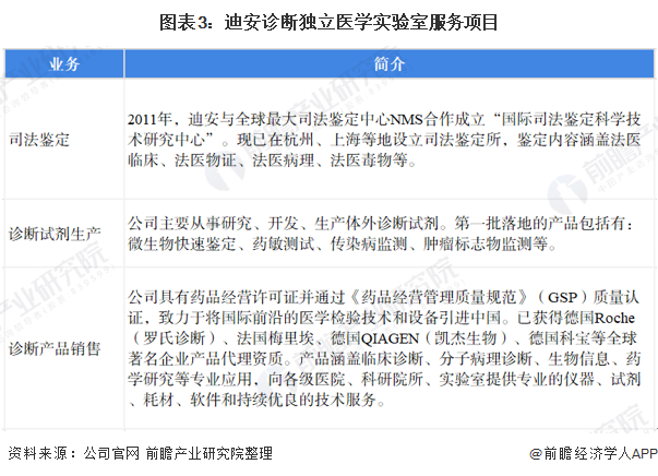 迪安诊断公司业务涵盖医疗诊断服务外包(独立医学实验室)、司法鉴定、诊断产品销售、诊断技术研发生产、CRO、健康管理等多个领域,拥有迪安医学检验中心、司法鉴定、基因工程、研发中心、迪安生物等业务板块。