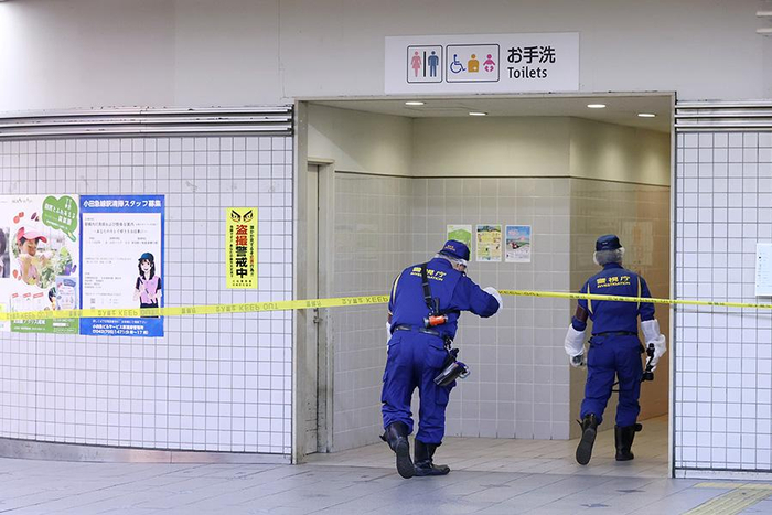 2021年8月6日,警察在日本东京地铁站事发现场工作。当日,一名男子在地铁上持刀刺伤至少十名乘客,随即逃跑,不久后被警方逮捕。