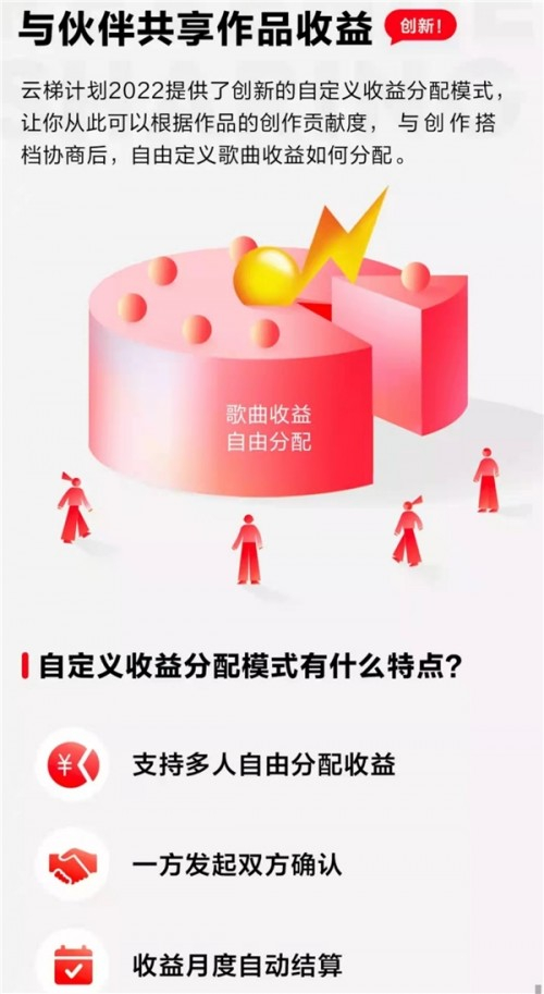“云梯计划2022”于业内首创了自定义收益分配模式,促进共同创作共享收益。此前,业内针对词、曲、唱三方是一个固定的收益分配比例。“云梯计划2022”创新的收益分配模式,支持词、曲、唱三方创作者自行协商后,根据作品贡献度自定义分配比例。