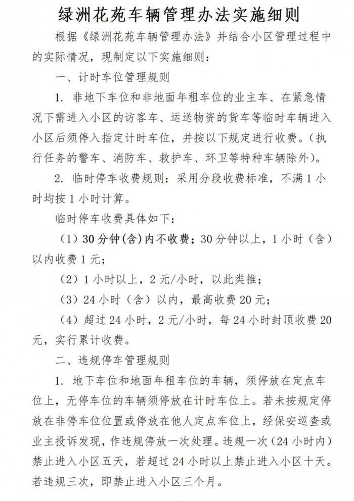绿洲花苑停车收费从2021年1月1日起施行,对非地下车位和非地面年租车位的业主车、在紧急情况下需进入小区的访客车等临时车辆进行收费。