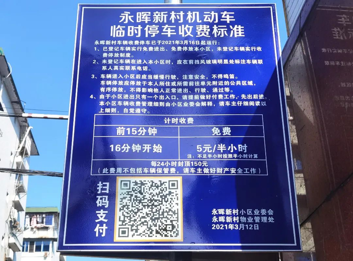 11月26日记者来到永辉新村,大门口就竖立着“本小区停车收费”的牌子,对于未登记车辆进行计时收费,前15分钟免费,第16分钟开始,每半小时收费5元,每24小时封顶150元。