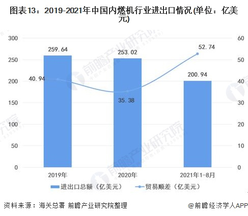 根据海关总署数据,2020年中国内燃机行业进出口总额达到253.02亿美元,同比2019年下降2.55%。其中进口额为108.82亿美元,出口额为144.20美元,实现贸易顺差35.38亿美元。