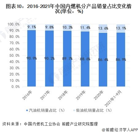 分不同内燃机类型来看,2016-2020年,全国柴油机销量占比逐年上升,而汽油机销量占比逐年下降,主要是由于以乘用车为代表的汽油机电动化替代水平不断提升。2021年1-9月,在全国内燃机销售市场中,柴油机销量占比13.1%,而汽油机销量占比96.9%。