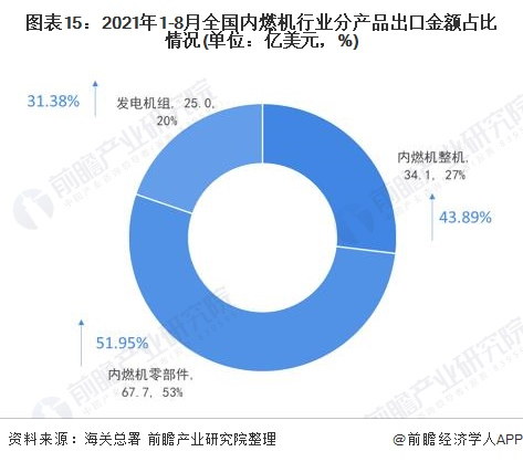 从出口市场来看,2021年1-8月,内燃机整机进口额为34.1亿美元,占比27%,同比增长43.89%;内燃机零部件进口额为67.7亿美元,占比53%,同比增长51.95%;内燃机发电机组进口额为25亿美元,占比20%,同比增长31.38%。整体来看,内燃机行业出口市场各细分领域均呈现强劲增长态势。