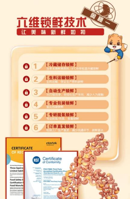 新鲜是三只松鼠量贩坚果产品的第二个特性。这次,三只松鼠运用了“六维锁鲜”的工艺,通过创新保鲜技术,让坚果更能满足消费者对产品的新鲜需求,在整体上提升了坚果的品质。