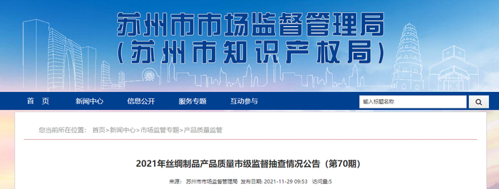 中国质量新闻网讯  11月29日,苏州市市场监督管理局网站发布《2021年丝绸制品产品质量市级监督抽查情况公告(第70期)》。