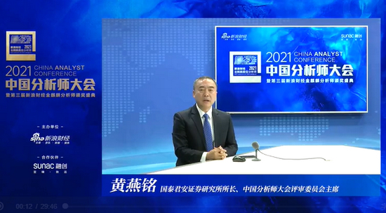今天,2021中国分析师大会暨第三届新浪财经金麒麟最佳分析师颁奖盛典隆重召开。国泰君安研究所所长、中国分析师大会评审委员会主席黄燕铭发表了重要演讲。
