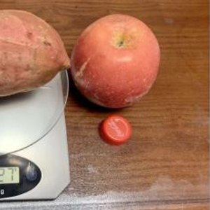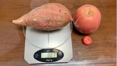 我们随手抓一个爱瓜上称,显示它的体重为327克。按10%去掉不可食部分,建议吃小半个或更少。