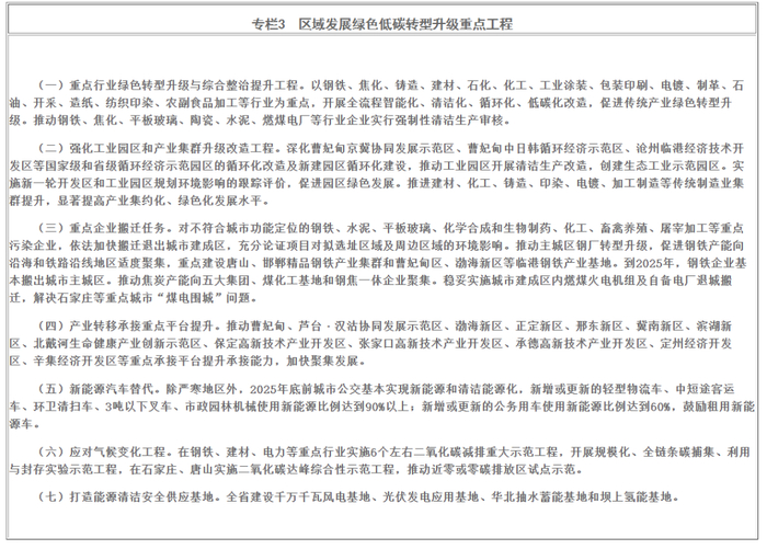 关于钢铁行业,《规划》中提到,河北省将加速构建区域绿色协调发展格局,构建多元融合绿色低碳产业体系,组织地方和重点行业根据自身情况制定碳达峰路线图、行动方案和配套措施,推进钢铁、建材等重点行业尽早碳达峰;并推动区域能源清洁高效协同发展,严格落实煤炭减量替代,以钢铁、化工、水泥、玻璃等行业为重点,每年优选200个项目列入千项技改,实施工业节能低碳技术改造。
