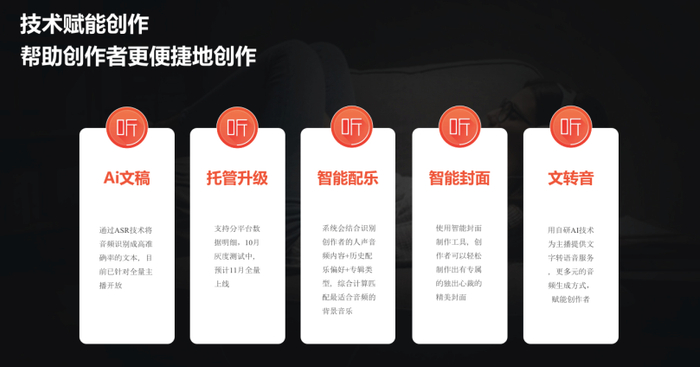 喜马拉雅通过技术和政策手段赋能创作者,目前已推出各种创作工具和功能,组成工具包,如云剪辑、AI文稿、音频转文字辅助剪辑、智能配乐、智能封面、智能音量、TTS(文字转音频)、主播打赏、播客托管升级等等。