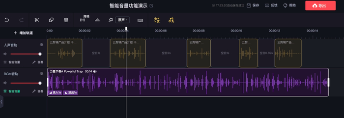 “智能音量”功能则类似于智能配乐的逻辑。AI系统通过智能算法解决了创作者、特别是播客创作者创作内容时,人声音量和背景配乐音量参差不齐的问题。智能音量功能可以让人声音量和背景配乐音量互相协调,人声进行时,背景配乐音量智能下调;人声暂歇时,背景配乐音量智能上调。