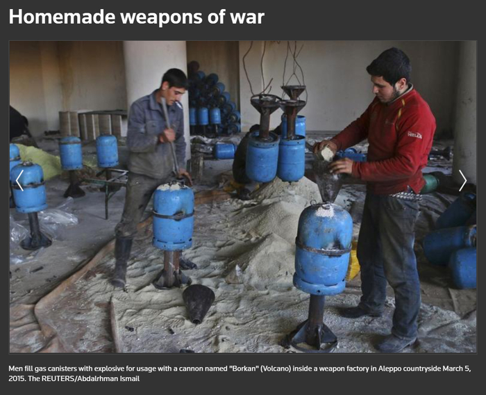 路透社在2015年3月9日发布的图集“自制战争武器(Homemade weapons of war)”中,将该形制的炮弹称为“火山”(Borkan),图片中两名男子正往煤气罐填装炸药(见下图)。