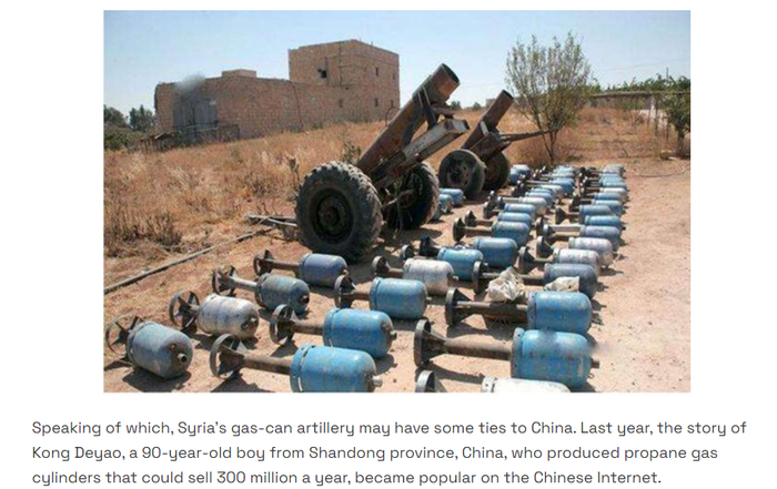 这一说法在英文互联网上也有流传。今年2月,China-arms网站发表文章,称叙利亚的煤气罐大炮来自中国,并暗示“90后”小哥孔德尧在其中扮演了关键角色。