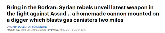 “引进火山:叙利亚叛军公布了对抗阿萨德的最新武器……一个安装在挖掘机上的自制大炮可将煤气罐炸出两英里远”
