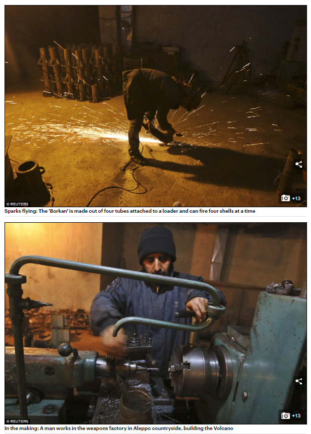上:“火星飞溅:火山是由四根管子组成,连接到一个装载机上,一次可以发射四枚炮弹”下:“正在制作:一男子在阿勒颇乡间的武器工厂中工作,制造火山”