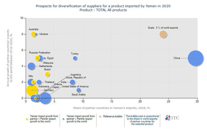 由于常年战乱,也门国内物资极度匮乏,大量依赖进口。国际贸易中心(International Trade Centre)数据显示,2020年,也门进口额达到97.1亿美元,贸易逆差达到83.1亿美元。中国是也门最大的进口国,从中国进口的资源占其总进口份额的29.7%。