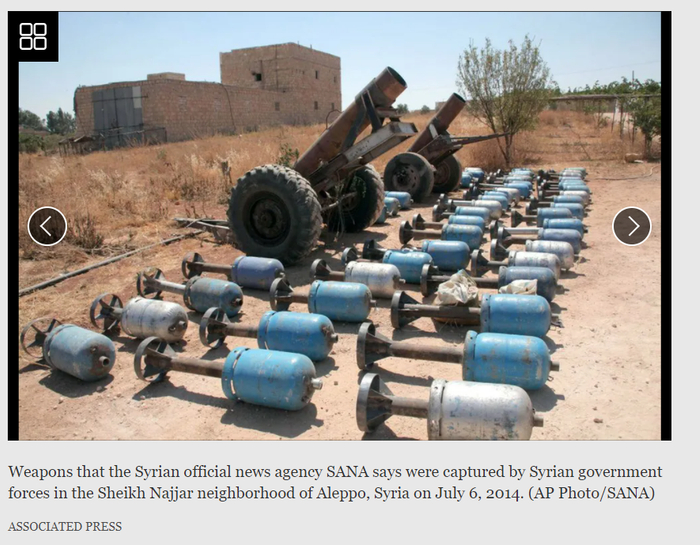 通过谷歌图片对视频中最后这张煤气罐炮弹整齐排列的图进行反向搜索后发现,该图片最早于2014年7月6日由美联社发布。根据叙利亚官媒叙利亚阿拉伯通讯社(SANA)的说法,这些武器是叙利亚政府军于阿勒颇地区的谢赫·纳贾尔(Sheikh Najjar)街区缴获的。