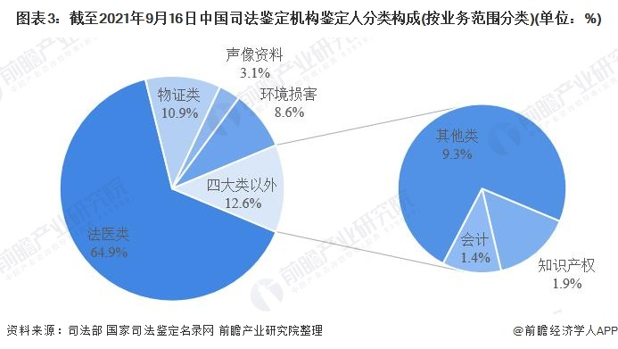 从鉴定人分类来看,目前,我国司法鉴定人主要以“四大类”司法鉴定业务为主,且比重仍在持续提升中。具体到细分领域来看,据司法部国家司法鉴定名录网数据,截至2021年9月16日,全国“四大类”司法鉴定人数量为32359人,其中,法医类司法鉴定人数量最多达24016人,占总量的64.9%;其次是物证类司法鉴定人,数量位居第二,为4017人,占总量的10.9%;环境损害类位居第三,为3183人,占总量的8.6%;声像资料类司法鉴定人有1143人,占总量的3.1%。