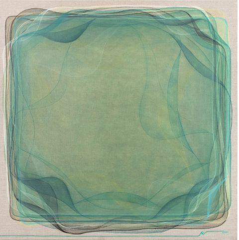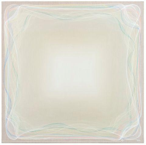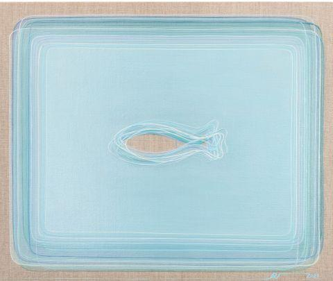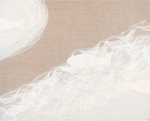 艺术家潘然谈到自己的创作时说:“我的画面只有曲线,即使直线也是有弧度的,它们首尾相接,像一个‘圆’,也可以是一个莫比乌斯环,跨越维度的无限循环。把彼岸世界转移到现实世界,把对未来的向往转换为对内心的探求。当线条滑过二维,与惯性对抗,才有可能制造出我需要的线。而惯性,是弧度,一种有限的坠落,然后深吸一口气,呼出瞬间,笔尖滑过,如同弦一般的存在。我要表述的,就是让绘画脱离物质的本质……作为理论物理的一个分支学科,弦论的一个基本观点是,自然界的基本单元不是电子,光子,中微子和夸克之类的点状粒子,而是很小很小的线状的‘弦’,包括有端点的‘开弦’和圈状的‘闭合弦’。弦的不同振动和运动就产生出各种不同的基本粒子,能量与物质是可以转化的,故弦理论并非证明物质不存在,它也可能是量子引力的解决方案,更有可能成为描述世界的终极理论。画面中的光晕是海所给予的对待色彩的体验,使我有机会摆脱色彩的惯常认知,从而用‘虚无’来塑造颜色。画笔成为自己与自然相互呼应的媒介,并以此来表达我对生命的认识。近二十年才找到寓意的绘画语言,一直在自我限制中体验绘画的内在形式,此时媒介与我就像去经受的内心体验,获得某种难以言传的感悟,用重复的简洁的工作去寻找情感与精神的另外需求当我们将视界置于更高维度,也许问题已不存在。”