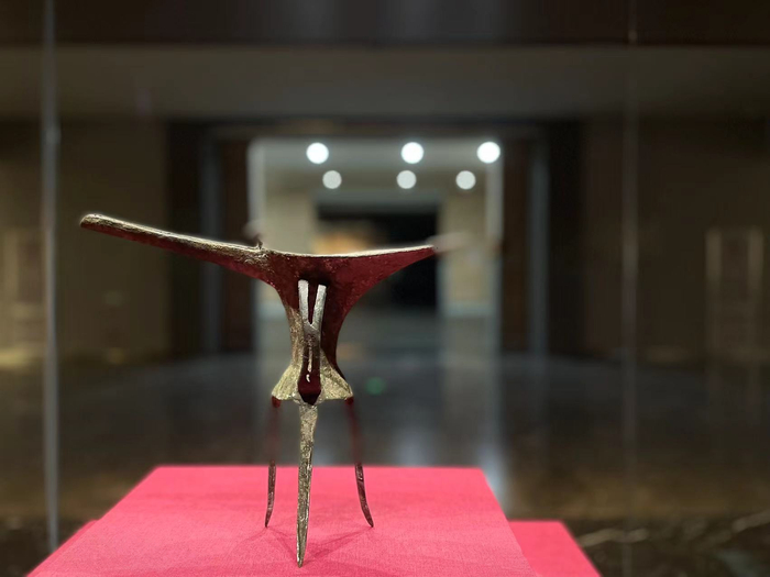 走进博物馆内部,大厅中形似“大喇叭”的造型是仿照二里头遗址出土的“华夏第一爵”——乳钉纹铜爵造型设计的。这一铜爵是罕见的夏朝青铜器,典雅而轻盈,有棱有弧,“青铜爵”造型不仅支撑着中央大厅屋顶,同时还是个电梯井,通过它到达三层,来到作为眺望二里头遗址的观光回廊,在环廊内,环游屋面平台,可把博物馆北边的二里头遗址区尽收眼底。
