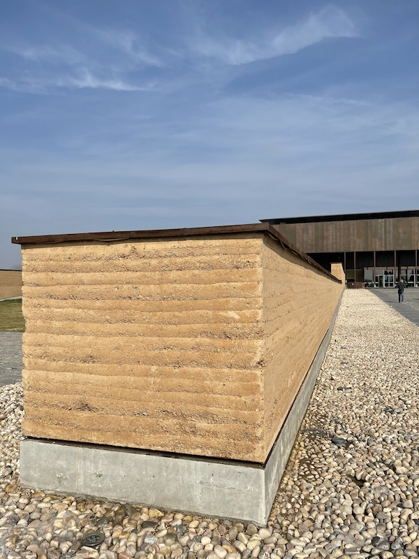除了在设计理念及建筑造型上突出“最早的中国”,二里头夏都遗址博物馆夯土墙的运用也让人印象深刻。在博物馆的外围有一个15厘米厚的夯土抹面,博物馆的40厘米外墙底部也为夯土。据设计方此前介绍,夯土建筑自古有之,二里头遗址是土遗址,遗址的宫城内外也先后发现多座大小不同的夯土建筑基址。在建筑设计中,用最原始的材料——土、沙、石、水,打造原生态、肌理自然的夯土墙面,会让人有种追本溯源的意味,并更为真切地体会到二里头遗址“最早中国”的原始、古朴与粗狂感。