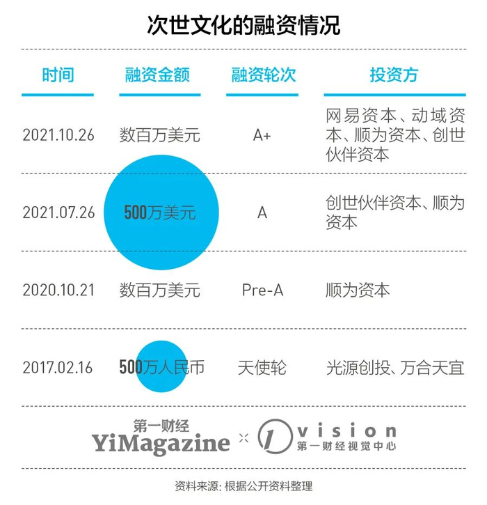 自2017年2月起至2021年11月,次世文化已经获得由网易、动域、创世伙伴、顺为等多家投资机构带来的千万美元投资,累计融资达四次。其中,顺为资本与创世伙伴资本作为老股东多次跟投。