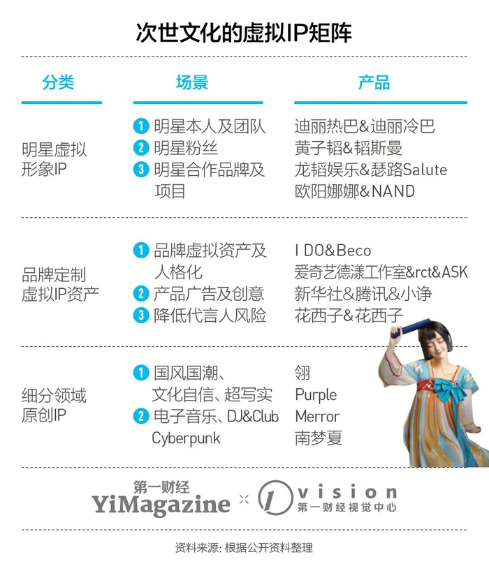 与人工智能平台小冰公司等技术公司的合作,帮助次世文化为虚拟人提供整套形象策划与运营方案。明星虚拟形象、品牌定制虚拟IP资产、细分领域原创虚拟人,构成了次世文化建立市场与品牌认知,拓展业务边界的三条核心主线。至于如今B站炒得较热的虚拟主播,以及虚拟直播带货都不在次世文化的业务范畴内。