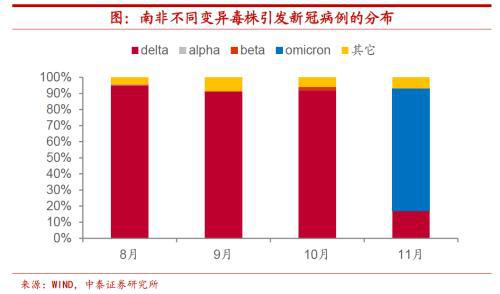 Omicron后来居上,已成南非优势毒株。尽管这一变异毒株在11月刚刚被发现,但其已经很快成为了南非的优势毒株。根据NGS-SA发布的数据,今年8-10月,南非监测的病例样本中,Delta变异毒株引发的病例占比超过90%,而11月Omicron变异毒株后来居上,在南非的病例占比中高达76%,而Delta变异毒株病例占比被压缩到17%,这也是WHO将其很快纳入VOC名单的原因所在。