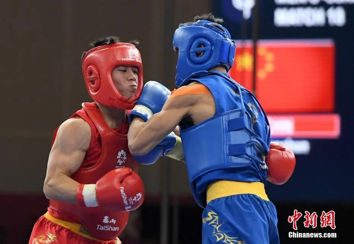 2018年雅加达亚运会男子散打56公斤级决赛,中国选手申国顺(红方)对战越南选手TRUONG GIANG BUI 中新社记者 侯宇 摄