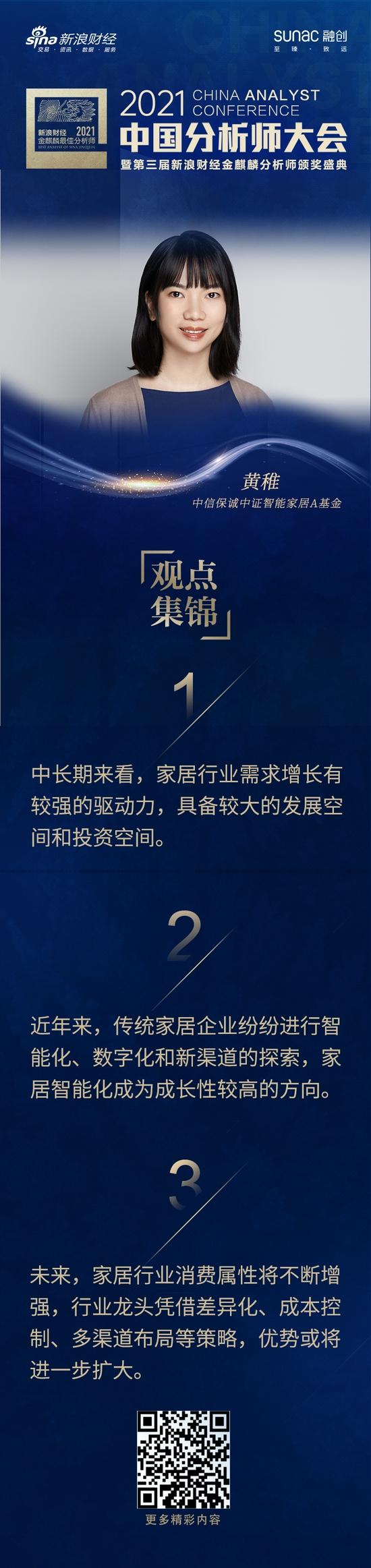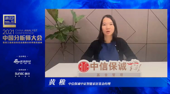 今天,2021中国分析师大会暨第三届新浪财经金麒麟最佳分析师颁奖盛典隆重召开。中信保诚中证智能家居A基金经理黄稚对家居生活行业的中长期投资机会发表观点。