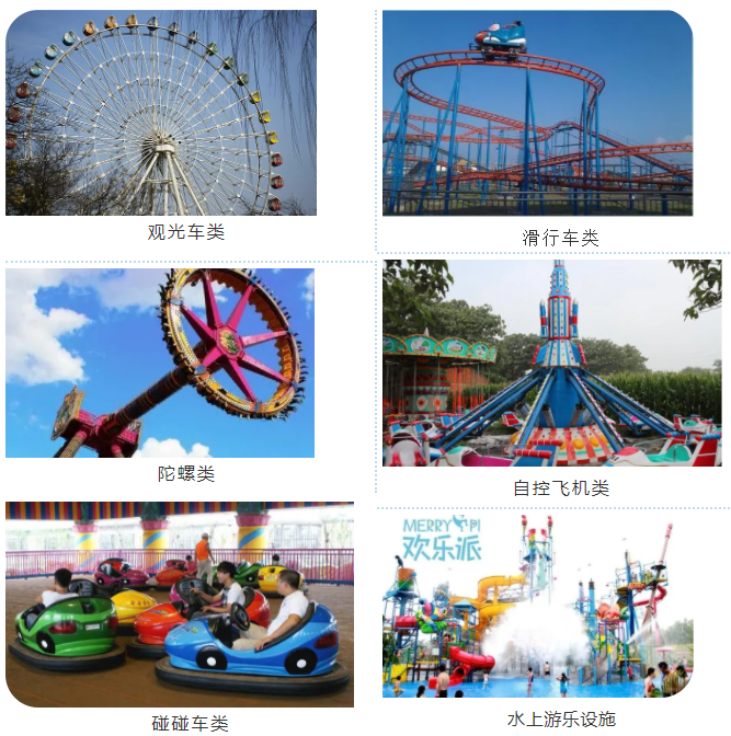 根据特种设备目录规定,大型游乐设施是指用于经营目的,承载乘客游乐的设施,其范围规定为设计最大运行线速度大于或者等于2m/s,或者运行高度距地面高于或者等于2m的载人大型游乐设施。用于体育运动、文艺演出和非经营活动的大型游乐设施除外。大型游乐设施种类繁多,结构及运动形式各种各样,规格大小相差悬殊,外观造型各有千秋。目前纳入特种设备管理目录的大型游乐设施依据主要运动特点和形式共分为13个类别,即:观览车类、滑行车类、架空游览车类、陀螺类、飞行塔类、转马类、自控飞机类、赛车类、小火车类、碰碰车类、滑道类、水上游乐设施、无动力游乐设施等。