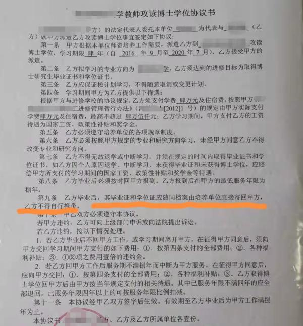 “学校要求我先缴纳近80万的赔偿,否则不给办理人事档案和社会保险转移手续。”曾为河南某高校教师的周寻(化名)向澎湃新闻(www.thepaper.cn)反映,她读博前与学校签订协议,校方承诺承担其读博的费用,她毕业后需要回校工作八年。但博士毕业之际,她因个人原因提出离职。几经周折,学校同意其离职,但迟迟不转出其档案和社会保险关系,并提出高额索赔。