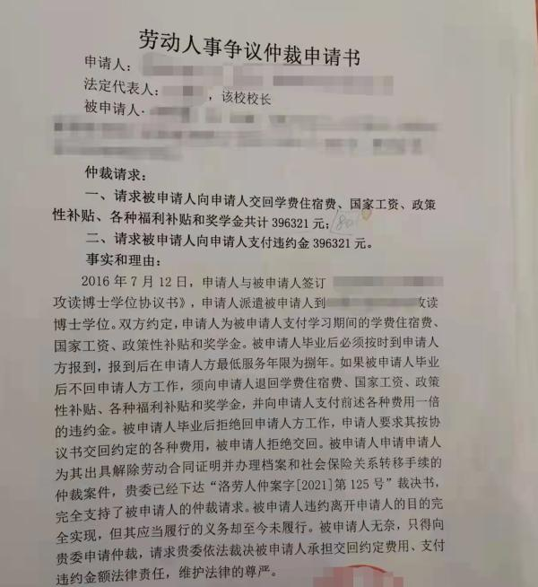 9月29日,学校方面向洛阳市劳动人事争议仲裁委申请仲裁,请求周寻向学校交回相关费用。申请书称:“被申请人违约离开申请人的目的完全实现,但其应当履行的义务却至今未履行。”