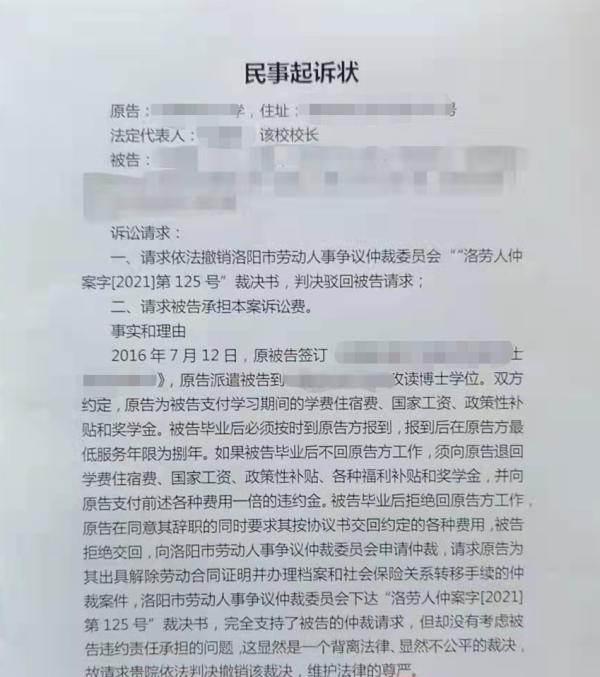 周寻提供的盖有学校公章的《民事起诉状》也显示,9月29日,学校请求洛阳市洛龙区法院撤销洛阳市劳动人事争议仲裁委员会前述裁决书,判决驳回被告请求。该《民事起诉状》称,洛阳市劳动人事争议仲裁委员会下达的裁决书完全支持了被告的仲裁请求,但却没有考虑被告违约责任承担的问题,这显然是一个背离法律、显然不公平的裁决。前述文件盖有学校公章。