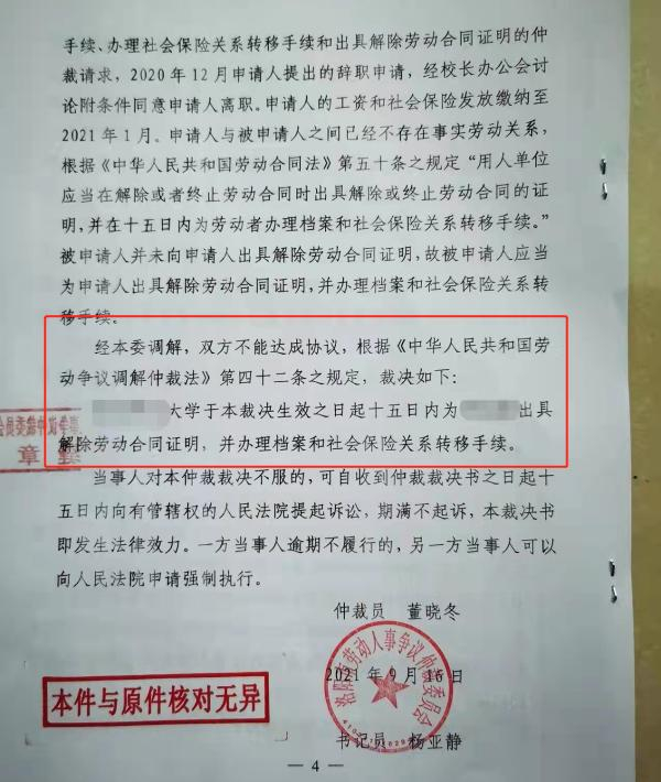 9月16日,仲裁委裁决如下:该校于本裁决生效之日起十五日内为其出具解除劳动合同证明,并办理档案和社会保险关系转移手续。