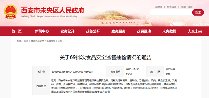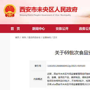 西安市未央区市场监管局发布69批次食品安全监督抽检情况