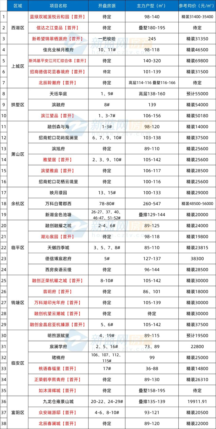 据蓝房君不完全统计,12月杭州预计将有38个楼盘开盘,其中有20个纯新盘加速面市。从区域来看,临安区和萧山区将是供应主力,共有12个楼盘入市。