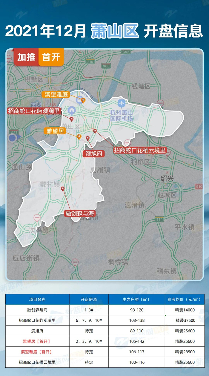 萧山一直是供应大户,12月预计6盘计划推新,其中纯新盘有两个,分别是南部新城的雅望居和萧山科技城的滨望雅庭。