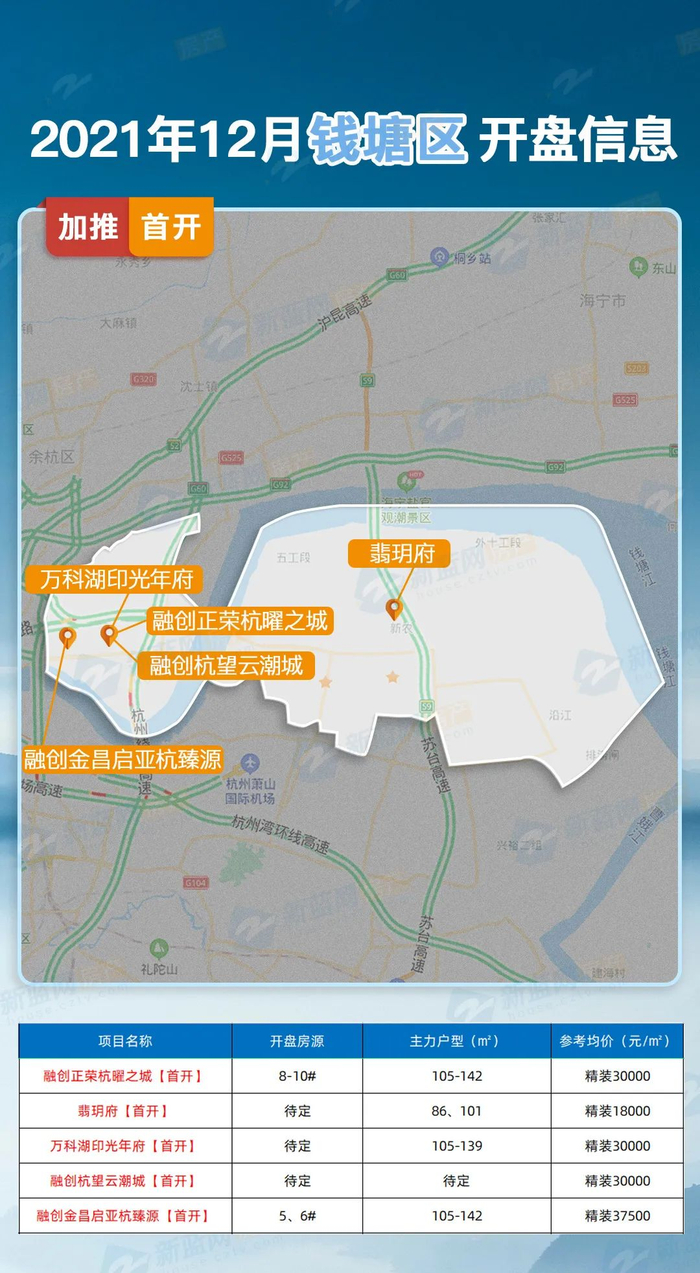 12月,钱塘区预计5个纯新盘集中面市,其中融创金昌启亚杭臻源是继春风金沙、湖上春风后,金沙湖板块内的又一新房供应。