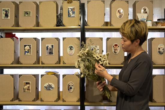 4月1日,广西南宁市,一位宠物行业工作人员在挑选祭奠用的干花。俞靖/摄(视觉中国供图)
