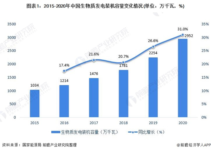 从生物质发电装机容量来看,2015-2020年,全国生物质发电装机容量不断扩大。截至2020年底,全国生物质发电新增装机543万千瓦,全国生物质发电装机容量达2952万千瓦,同比增长31.0%。