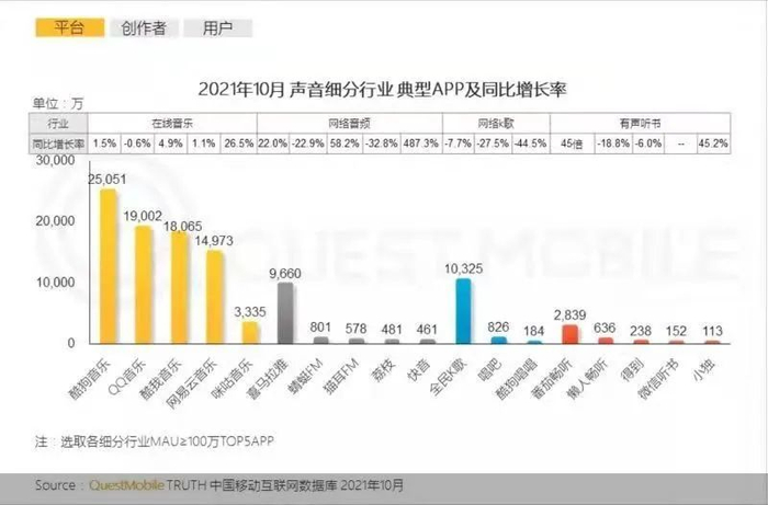 按照QuestMobile的归类,荔枝所在的网络音频,与在线音乐、网络K歌、有声听书同在移动互联网声音赛道。数据显示,2021年10月,声音人群规模7.28亿,其中,在线音乐、网络音频、网络K歌、有声听书月活用户分别为6.63亿、1.20亿、1.14亿、0.38亿。